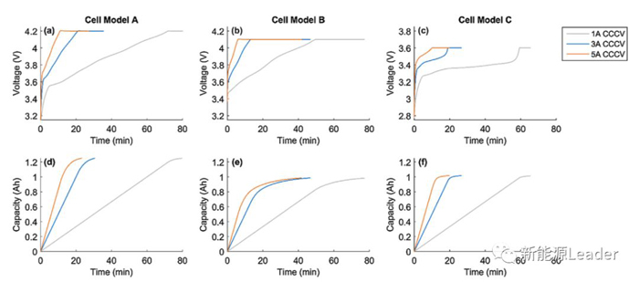 所謂的加速充電模式是在CCCV充電模式的基礎(chǔ)上增加了一個(gè)大電流的CC或者恒功率充電過(guò)程,從而達(dá)到降低充電時(shí)間的目的(如下圖e所示),有研究表明加速充電模式能夠有效的提升鋰電池的充電效率,同時(shí)又不會(huì)對(duì)鋰電池的循環(huán)壽命產(chǎn)生顯著的影響。