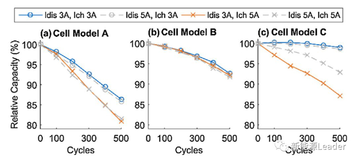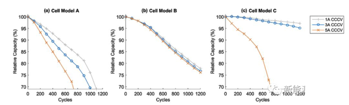 下圖為采用CCCV充電策略時(shí)不同的充電電流對(duì)于電池循環(huán)壽命的影響,從圖中能夠看到對(duì)于電池A,大充電電流會(huì)造成電池壽命的顯著下降,例如1A充電時(shí)電池的壽命可達(dá)1000次,3A充電時(shí)電池的壽命就會(huì)下降到800次,而充電電流達(dá)到5A時(shí)電池的壽命則僅為600次左右。但是對(duì)于電池B不同的充電電流對(duì)于電池的循環(huán)壽命并沒(méi)有顯著的影響。對(duì)于電池C在1A充電時(shí)電池循環(huán)1200次后容量保持率仍然可以達(dá)到97%,3A充電時(shí)電池循環(huán)1200次后容量保持率為95%,但是在5A充電時(shí)電池壽命會(huì)發(fā)生快速衰降,壽命不足700次。