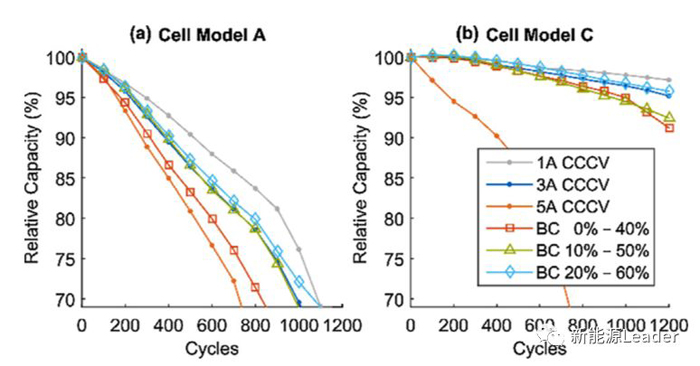 下圖為電池A和C采用BC充電策略的循環(huán)性能,從圖中能夠看到對(duì)于電池A,如果從0%開始采用加速充電(5A)則會(huì)導(dǎo)致電池的衰降速度顯著增加,與5A電流的CCCV充電策略接近。而如果從10%SoC和20%開始加速充電,則循環(huán)壽命會(huì)大大改善,與3A電流的CCCV充電策略接近。而對(duì)于電池C,如果開始加速充電的SoC為0%和10%則會(huì)導(dǎo)致電池的衰降速度明顯加速,而如果在20%SoC開始加速充電,則對(duì)于電池的循環(huán)壽命的影響較小。這也表明在較低的SoC下進(jìn)行加速充電會(huì)導(dǎo)致電池的循環(huán)壽命受到顯著的影響。